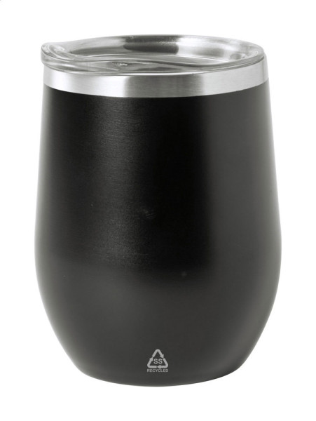 Doppelwandiger Thermobecher aus recyceltem Edelstahl mit Trinkdeckel aus Kunststoff. Füllmenge: 350 ml.