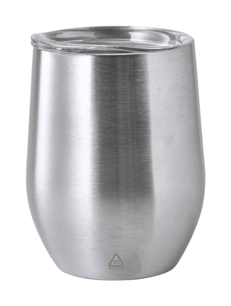 Doppelwandiger Thermobecher aus recyceltem Edelstahl mit Trinkdeckel aus Kunststoff. Füllmenge: 350 ml.