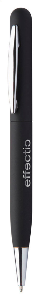 Drehkugelschreiber aus Metall mit gummierter Oberfläche und Spezialbeschichtung für eine Spiegelgravur, blauschreibend.