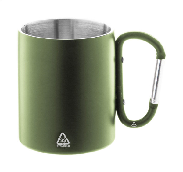 Doppelwandiger Thermobecher aus recyceltem Edelstahl mit farblich passendem Karabinergriff aus recyceltem Aluminium. Füllmenge: 300 ml. Einzeln in Kraftpapierbox.