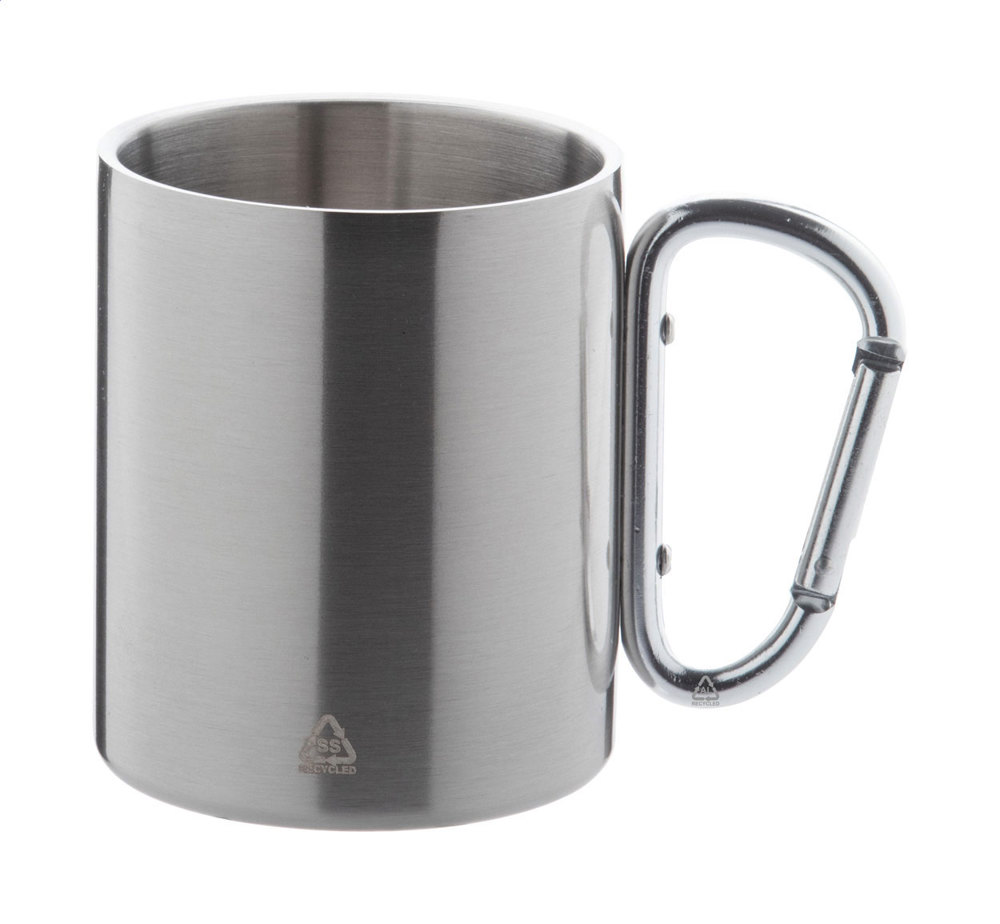 Doppelwandiger Thermobecher aus recyceltem Edelstahl mit farblich passendem Karabinergriff aus recyceltem Aluminium. Füllmenge: 300 ml. Einzeln in Kraftpapierbox.
