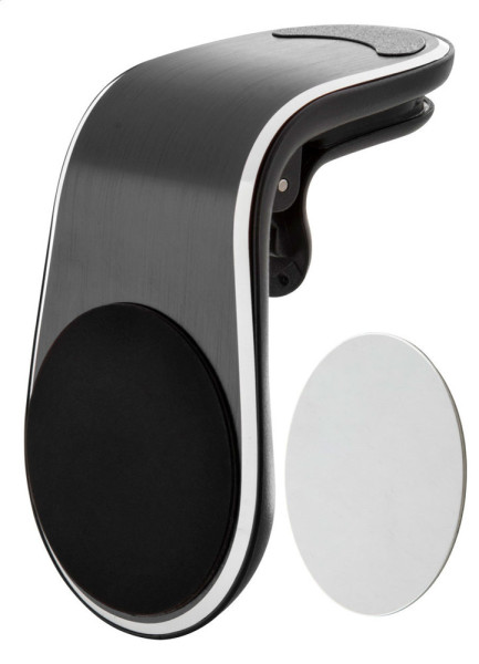 Magnetischer Handyhalter aus Aluminium. Die Befestigung erfolgt an der Lüftungsanlage. Inklusive selbstklebender Metallplatte.