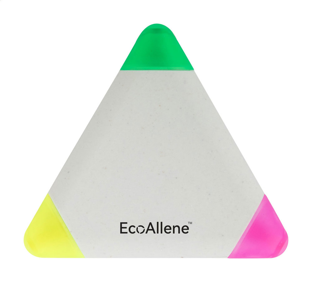 Dreieckiger Textmarker mit 3 Farben aus recyceltem EcoAllene®-Kunststoff. EcoAllene® ist ein neues und innovatives Material, welches aus dem Recycling von Getränkekartons gewonnen wird.