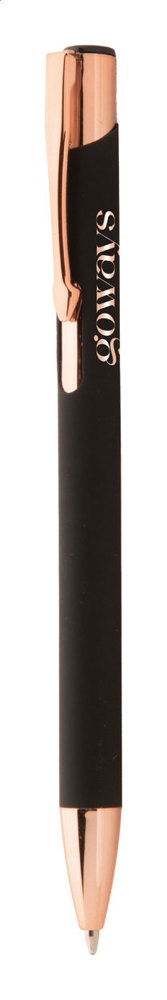 Kugelschreiber aus recyceltem Aluminium, mit gummierter Oberfläche und roségoldenen Elementen. Mit Spezialbeschichtung für Spiegelgravur in Roségold, blauschreibend.