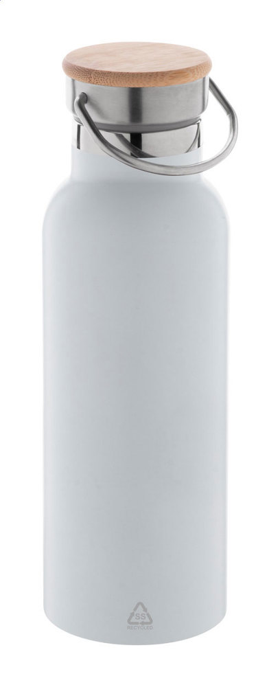 Doppelwandige Vakuumflasche aus recyceltem Edelstahl mit Bambus-Tragedeckel. Füllmenge: 500 ml.