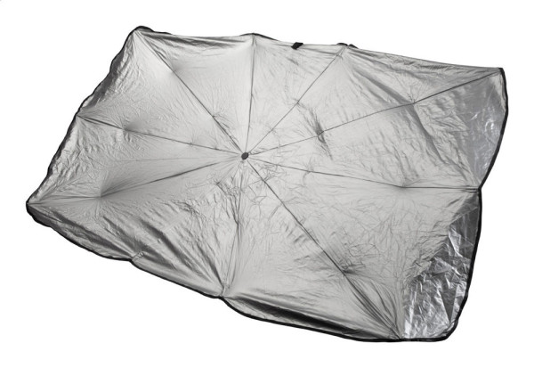 Faltbarer Sonnenblendenschirm für die Windschutzscheibe mit Metallrahmen, einzeln in Poyester-Beutel.