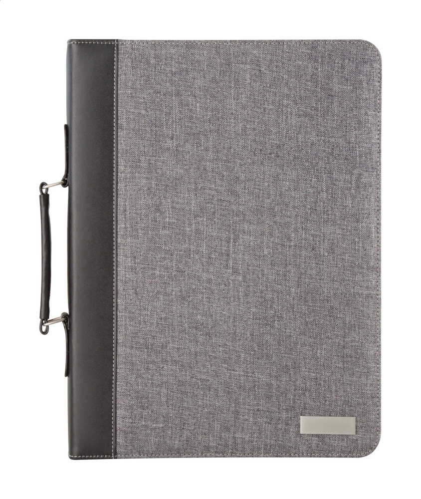 A4 Dokumentenmappe mit Reißverschluss, Notizblock mit 20 Seiten (liniert), solarbetriebenem Rechner und Metallplättchen. Material: Kunstleder und Leinen.