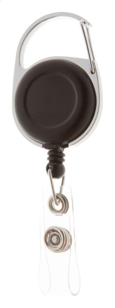 Ausweishalter aus Metall und Kunststoff mit ausziehbarer Schnur und Karabiner.