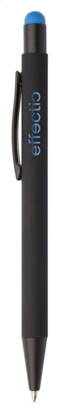 Aluminium-Kugelschreiber mit Touchpen und gummierter Oberfläche und Spezialbeschichtung für eine Farbgravur (Gravurfarbe abgestimmt mit Stylus), blauschreibend.