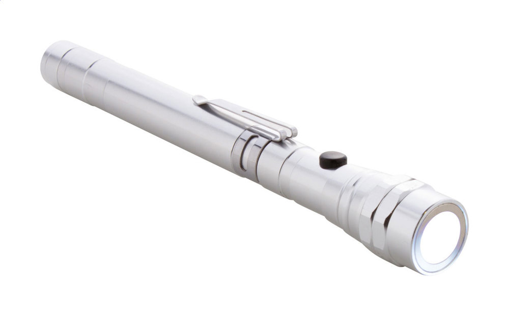 Aluminium-Taschenlampe mit 3 LED's, ausziehbarem und flexiblem Kopf, Magnet an der Oberseite und seitlichem Metallclip. Inklusive Knopfzellenbatterien. Max. Länge: 57 cm.