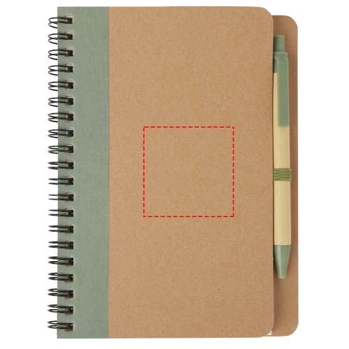 Notizbuch mit Deckel aus Recyclingkarton, 60 Blatt liniertem Recyclingpapier und passendem Stift. Das Notizbuch und der Stift sind zusammen verpackt.