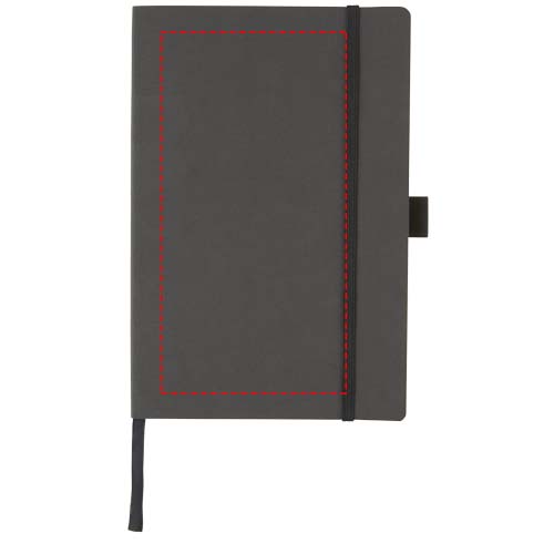 Flexibles Notizbuch mit weichem Einband (A5 Größen-Referenz) mit integriertem Gummiband-Verschluss, Lesezeichen-Bändchen, Stiftschlaufe, Dokumententasche an der inneren Rückseite und 80 Blatt (80 g/m²) cremefarbenem liniertem Papier. Verpackt in einer schwarzen Hülle.