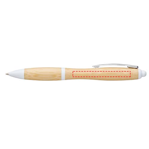 Kugelschreiber mit Klickmechanismus, mit einem Schaft aus Bambus, akzentuiert durch einen verchromten Clip und Verzierungen aus ABS-Kunststoff. Die Farbe des Bambusmaterials kann variieren.
