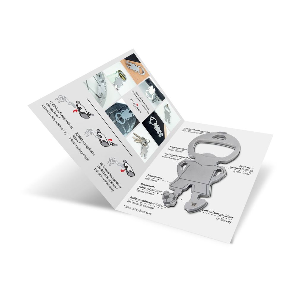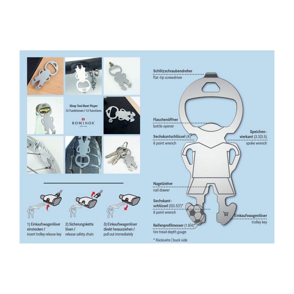 Den Bestseller aus der ROMINOX© Shoptool Serie gibt es jetzt auch als Fußballspieler-Version. Sie erhalten unseren Best Buddy Einkaufswagenlöser für den Schlüsselbund mit Fußballspieler-Gravur und im ROMINOX© Mäppchen! Werden Sie zum Trikotsponsor für diesen kleinen Alleskönner. Klein, leicht und doch vielseitig, überzeugen die Shop Tools im Alltag. Robuster Werkzeugstahl, inkl. Funktionsbeschreibung und Standard-Kartonverpackung, kundenindividuelle Verpackung ab 100 Stück möglich (Werkzeugstahl). In drei Designs verfügbar. Shop Tool als Schlüsselanhänger mit 12 Funktionen: 1 Einkaufswagenlöser, 1 Flaschenöffner, 1 Schlitzschraubendreher, 2 Reifenprofilmesser (1,6 mm und 4 mm), 1 Nagelzieher, 2 Speichenvierkant, 4 Sechskantschlüssel - ab 3‘000 Stück auch als Sonderproduktion mit individueller Form möglich. Sprechen Sie uns an!
