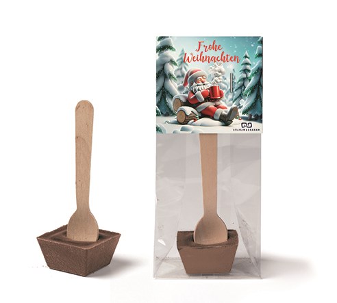 Die weltweit erste Schokoladenalternative ganz ohne Kakaobohnen. Mit der zartschmelzenden Alternative aus Sonnenblumenkernen wird über 80% an Wasser und Co2 im Vergleich zu herkömmlicher Schokolade eingespart. Um die perfekte Tasse zuzubereiten, müssen Sie ca. 150ml heiße Milch oder Pflanzendrink in eine Tasse geben und den Holzlöffel hineinlegen. Der individuell bedruckbare Werbe-Reiter aus FSC®-zertifiziertem Karton ist oben platziert.