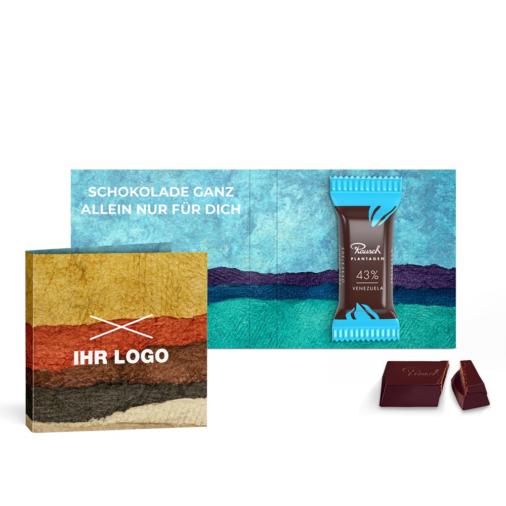 Verschenken Sie mit den puren "Rausch Plantagen" ganz besondere Schokoladen-Momente. Die Werbeklappkarte wird individuell beidseitig bedruckt und besteht aus FSC®-zertifiziertem Karton.