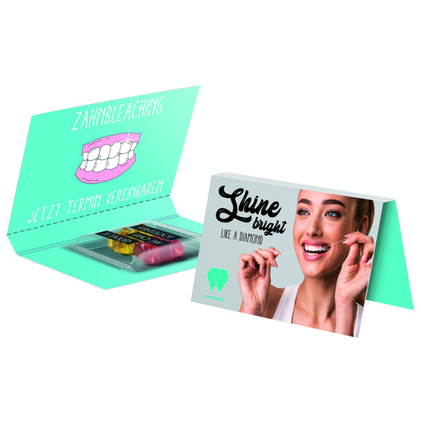 Aufklappbare Werbekarte im Visitenkartenformat, weißer Karton, mit praktischer Abreißperforation, individuell bedruckt. Inhalt: 1 Flowpack in Standardgestaltung (Motiv: together we can) mit 1 Trolli Team Gummibärchen in Premium Qualität mit 10 % Fruchtsaftanteil, bunt gemischt, 6,5 g