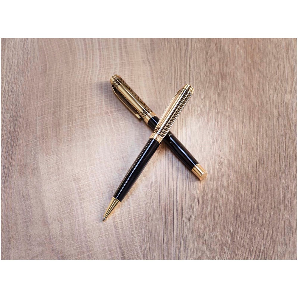 Das Legato Stifteset ist eine elegante Kombination aus einem Kugelschreiber und einem Tintenroller. Beide Kugelschreiber haben einen oberen Schaft aus recyceltem Messing mit goldfarbener Verchromung, einen unteren Schaft mit schwarzer Pulverbeschichtung, goldfarbene Metallaccessoires, ein LUXE-Logo auf dem mittleren Ring und blaue Tinte. Der Kugelschreiber hat eine Schreiblänge von 800 m und eine Strichstärke von 1,00 mm. Der Tintenroller hat eine Schreiblänge von 400 m und eine Strichstärke von 0,7 mm.
