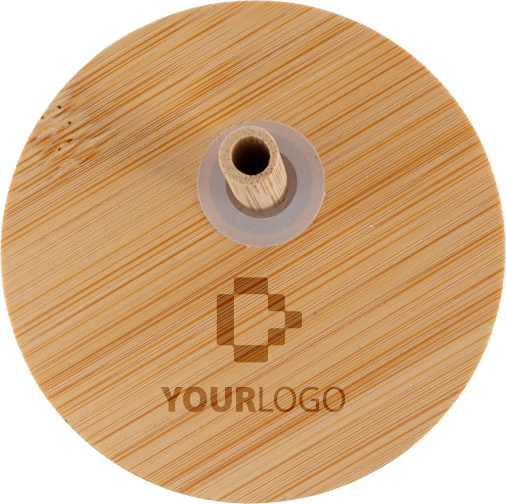 Einwandiger Trinkbecher (450 ml) aus Glas (Borosilikat) mit Korkhülle, Bambusdeckel und Strohhalm. Geeignet für heiße und kalte Getränke. Einzeln verpackt in einem braunen Karton.