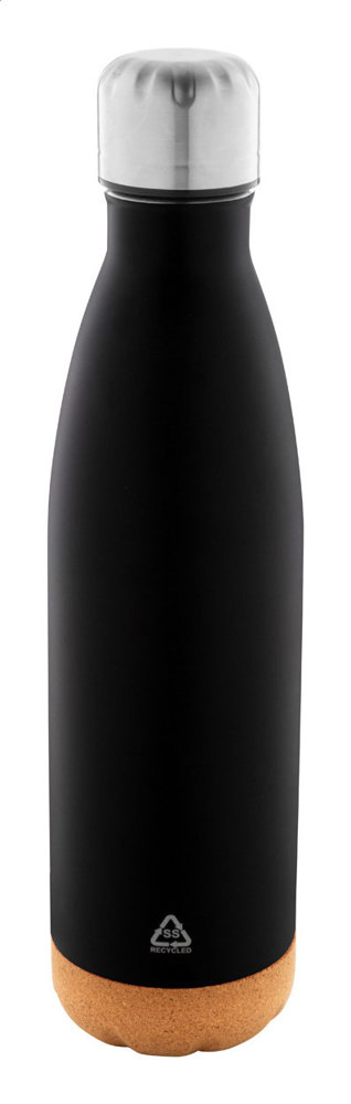 Doppelwandige vakuumisolierte Flasche aus recyceltem Edelstahl mit Boden aus Naturkork. Füllmenge: 500 ml.