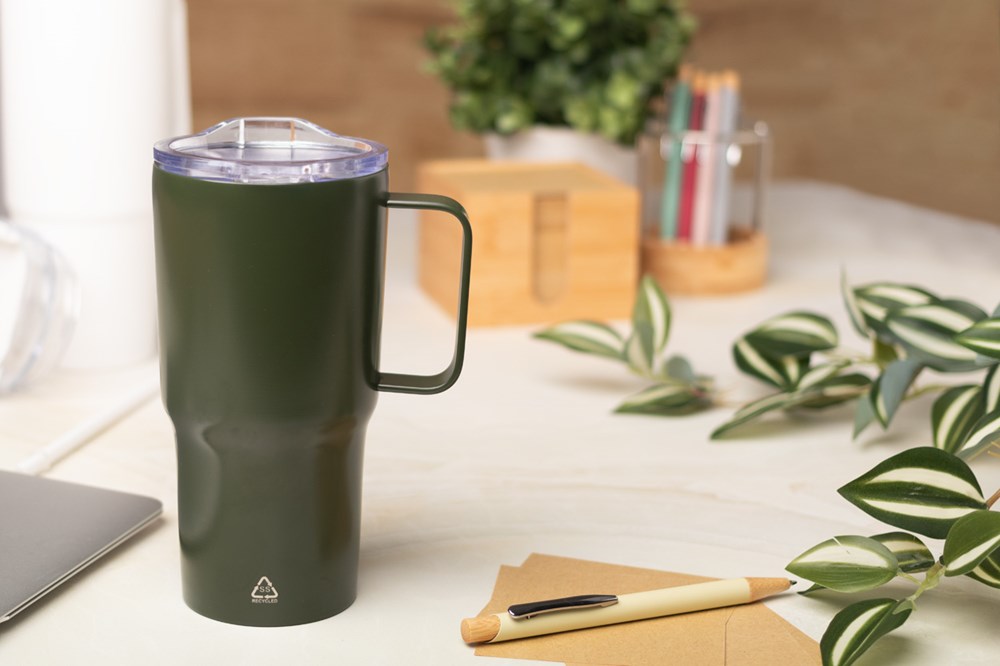 Doppelwandiger, vakuumisoloierter Thermobecher aus recyceltem Edelstahl mit Trinkdeckel aus PS Kunststoff. Füllmenge: 600 ml.