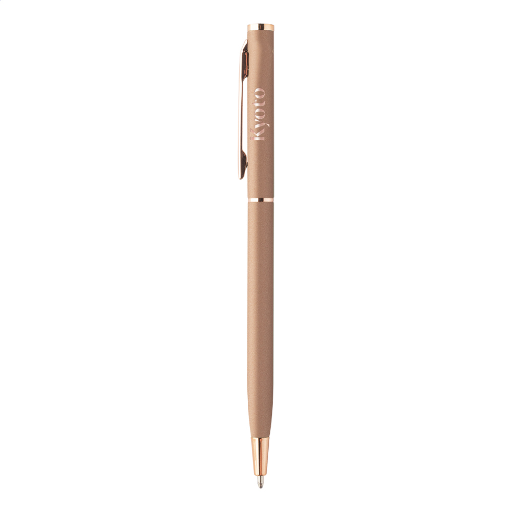 Drehkugelschreiber aus recyceltem Aluminium mit gummierter Oberfläche und rosagoldenen Elementen. Mit Spezialbeschichtung für rosagoldenfarbene Spiegelgravuren. Blauschreibend.