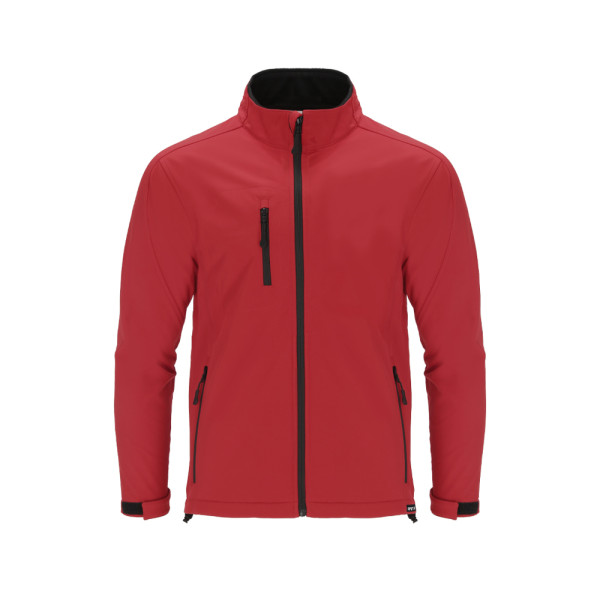 RPET Softshell-Jacke aus 3 Schichten, 340 g/m². Mit 8000mm Membran, wasserdicht und atmungsaktiv. Außen Softshell und innen Mikrofleece in Schwarz. Mit Außentasche auf der rechten Brust und zwei seitlichen Reißverschlusstaschen. Mit Zentralreißverschluss und umgekehrten Reißverschlüssen an den Taschen, einschließlich schwarzer Zugbänder. Raglanärmel mit Klettverschlusssystem an den Manschetten in Schwarz. Passender Kinnschutz und verstellbarer Bund mit elastischem Band und Stopper. RPET-Etikett am Saum des Kleidungsstücks.