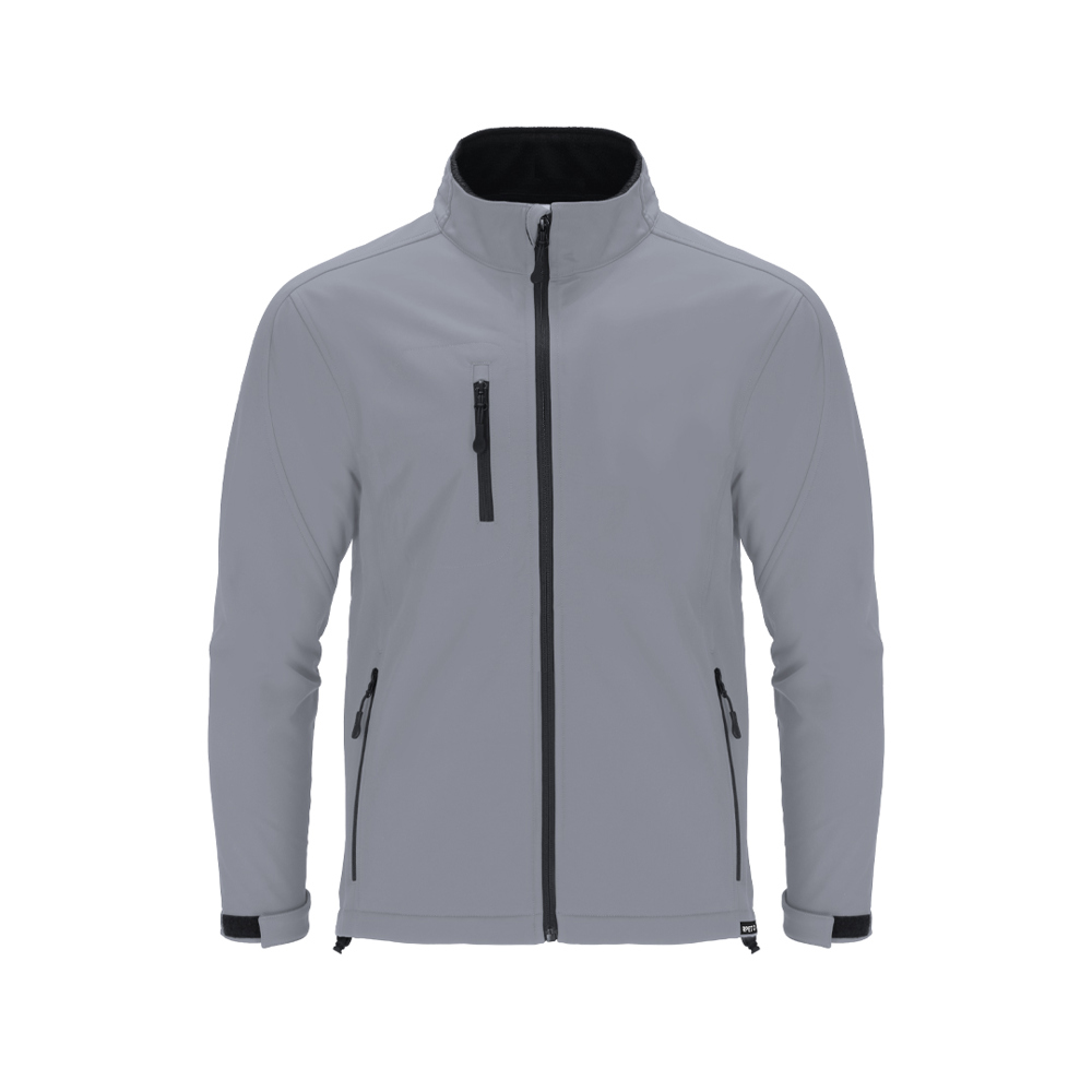 RPET Softshell-Jacke aus 3 Schichten, 340 g/m². Mit 8000mm Membran, wasserdicht und atmungsaktiv. Außen Softshell und innen Mikrofleece in Schwarz. Mit Außentasche auf der rechten Brust und zwei seitlichen Reißverschlusstaschen. Mit Zentralreißverschluss und umgekehrten Reißverschlüssen an den Taschen, einschließlich schwarzer Zugbänder. Raglanärmel mit Klettverschlusssystem an den Manschetten in Schwarz. Passender Kinnschutz und verstellbarer Bund mit elastischem Band und Stopper. RPET-Etikett am Saum des Kleidungsstücks.