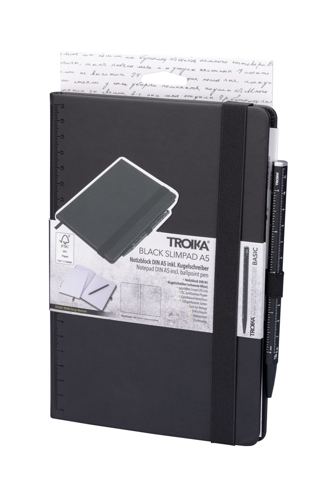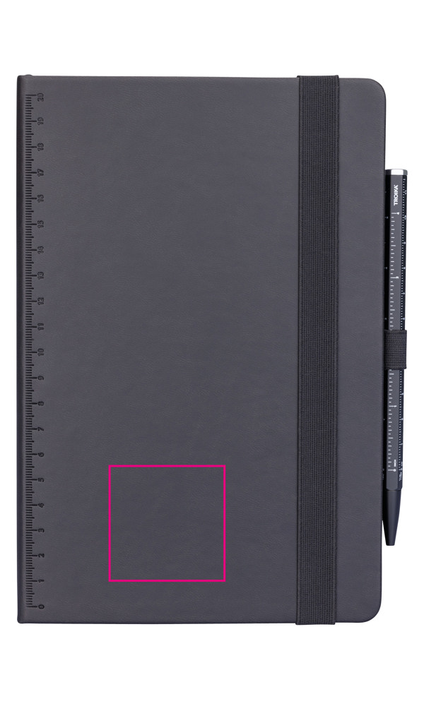 Notizblock DIN A5 inkl. Kugelschreiber, schwarzem Elastikband-Verschluss, Stiftschlaufe, Lesezeichen, geprägtes Lineal (20 cm) auf Cover, FSC zertifiziertes Papier, 64 perforierte Blätter (128 Seiten), mit schwarz eingefärbten Seitenrändern, Punktraster, Fach für Belege, Kugelschreiber CONSTRUCTION BASIC (schwarze D1 Mine), Kunstleder, Metall, matt, schwarz