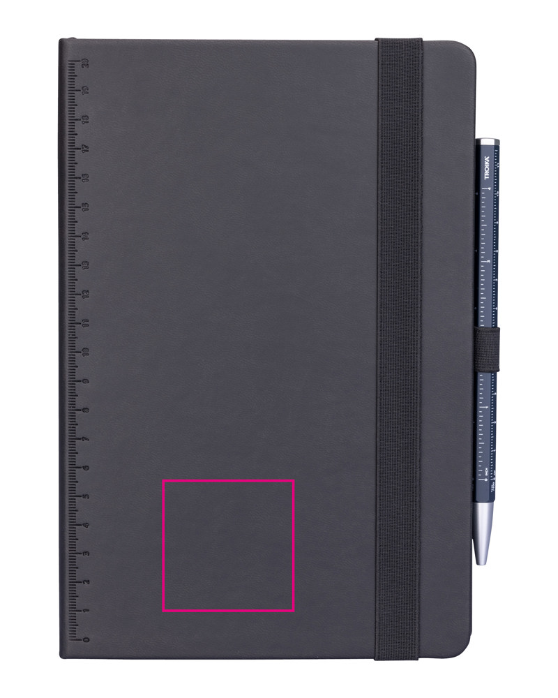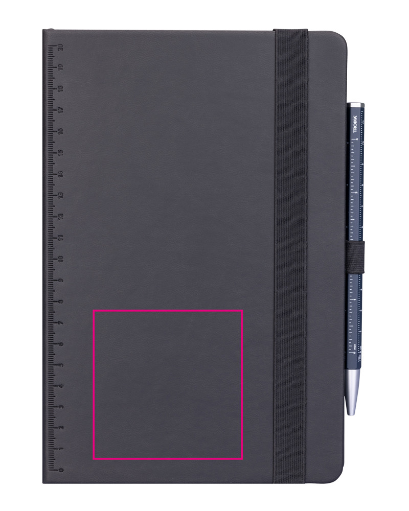 Notizblock DIN A5 inkl. Kugelschreiber, schwarzem Elastikband-Verschluss, Stiftschlaufe, Lesezeichen, geprägtes Lineal (20 cm) auf Cover, FSC zertifiziertes Papier, 64 perforierte Blätter (128 Seiten), mit schwarz eingefärbten Seitenrändern, Punktraster, Fach für Belege, Kugelschreiber CONSTRUCTION BASIC (schwarze D1 Mine), Kunstleder, Metall, matt, schwarz