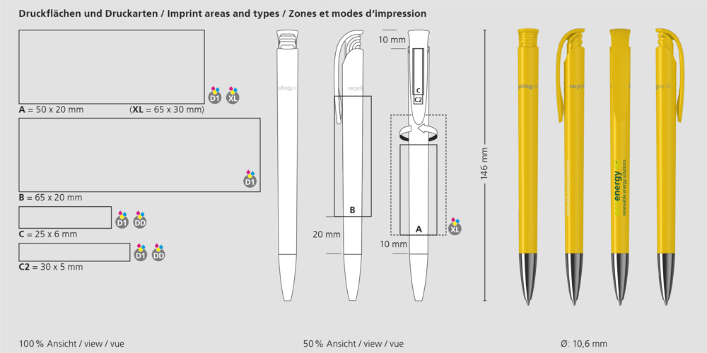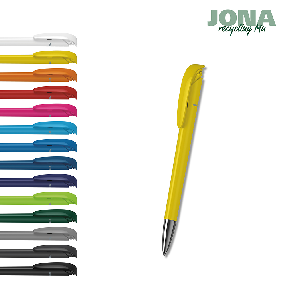 Der Jona recycling Mn ist ein Druckkugelschreiber. Materialien und Oberflächen: Spitze: Messing vernickelt. Schaft und Drückerklipp: Kunststoff (rABS) hochglänzend, recycelt. Minenröhrchen: Recyceltes Polypropylen (rPP). Standardfarben: Schaft und Drückerklipp: aus 14 Farben kombinierbar. Hinweis: Aufgrund der recycelten Rohstoffe kann es zu Farbabweichungen auch bei einzelnen Bauteilen eines Produktes kommen. Sonderfarben: ab 3.000 Stück, ab 25.000 Stück ohne PMS-Zuschlag. Standardmine: Silktech L (3.000 m), blau oder schwarz, Mine optional: Silktech XL, Multifill P, Multi-Gel.