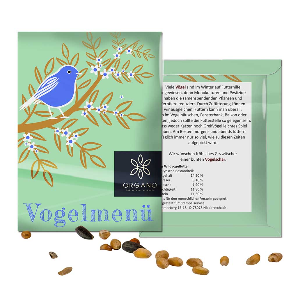 Die Themen Insektensterben und Flächenversiegelung sind in aller Munde. Eine Auswirkung ist ein massives Vogelsterben, da diese keine Nahrung mehr finden und somit die gefiederten Gesellen immer weniger werden. Mit dem Vogelfutter-Tütchen aus Recyclingpapier, in dem 20 g leckere Körner enthalten sind, kann der Kunde für die Artenvielfalt der zwitschernden Tiere aktiv werden und Gutes tun. Das Produkt eignet sich beispielsweise als Beigabe zum Vogelhäuschen oder einzeln für das nächste Mailing. Das in manchen Körnern enthaltene ätherische Öl kann in vereinzelten Fällen minimale Flecken auf der Tüte hinterlassen.
