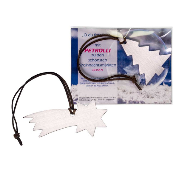 Die originellen Nussknacker aus Edelstahl, in den Formen Komet, Eiskristall oder Tannenbaum, bestechen durch ihre Funktionalität und ein edles Design. Der Nussknacker mit Lederband wird in einer transparenten Hülle mit individuell gestaltetem Einleger verpackt. Einfachdrehen und die härteste Nuss ist geknackt! Der formschöne Nussknacker ist gleichzeitig auch ein weihnachtlicher Edelstahl-Schmuck.