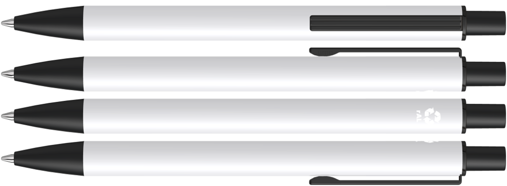 Metall-Druckkugelschreiber mit matter Oberfläche aus recyceltem Aluminium. Metallclip mit eingelassenen Rillen, Metallspitze und Drücker in schwarz matt.