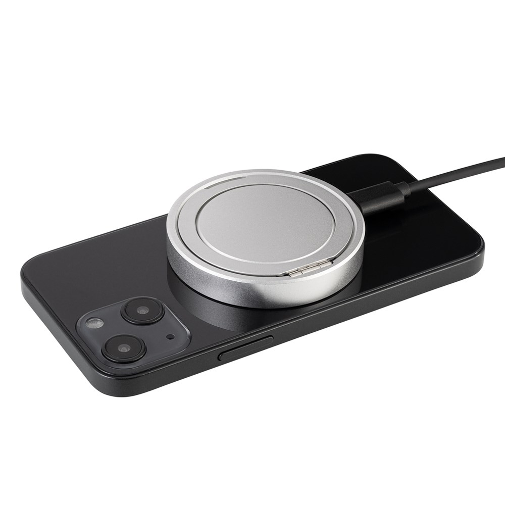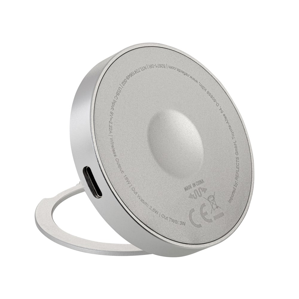 Dieser 3-in-1 multifunktionale Wireless Charger bietet Ihnen hohen Ladekomfort, sei es zu Hause, im Büro, im Café, am Flughafen oder am Bahnhof. Mit bis zu 15 Watt für kompatible Geräte und 3 Watt für Apple® Watch ermöglicht er äußerst effizientes Laden. Die magnetische Ladefläche bietet einen sicheren Halt für die Endgeräte, die die Technologie von MagSafe® unterstützen. Klappen Sie den Ring auf der Rückseite auf, wird der Charger im Handumdrehen zu einem praktischen Handyständer.