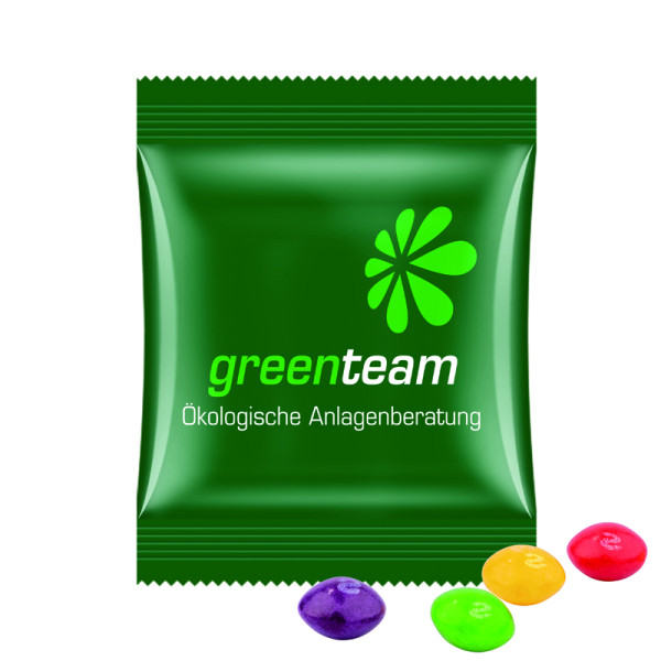 Skittles Fruits in Tüte aus weißer Folie, kompostierbar, individuell bedruckt. Inhalt: Skittles Kaubonbons, 10 g