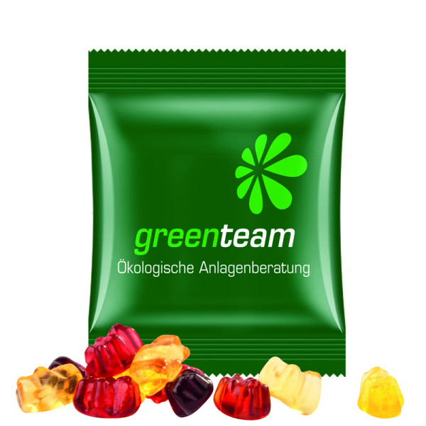Trolli Gummibärchen in Tüte aus weißer Folie, kompostierbar, individuell bedruckt. Inhalt: Trolli Gummibärchen in Fruchtsaftqualität Exquisit mit 30 % Fruchtsaftanteil, bunt gemischt, 15 g