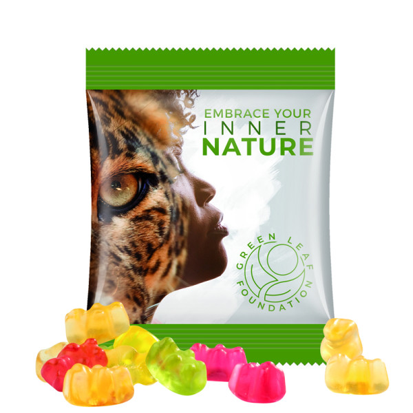 Trolli Fruchtgummi in Tüte aus weißer Folie, individuell bedruckt. Inhalt: Trolli Fruchtgummi Bärchen, in Premium Qualität mit 10 % Fruchtsaftanteil, bunt gemischt, 10 g
