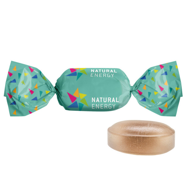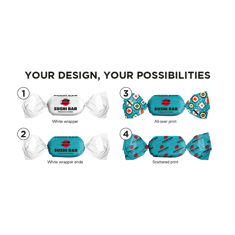 Ovales Minzbonbon gefüllt mit leckerem Schokoladenkern im Wickler aus kompostierbarer weißer Folie, gefüllt, individuell bedruckt. Inhalt: Schoko-Minz Bonbon, oval, gefüllt mit leckerem Schokoladenkern, einzeln eingewickelt, Mindestmenge 50 kg (ca. 9.200 Bonbons), 5 g