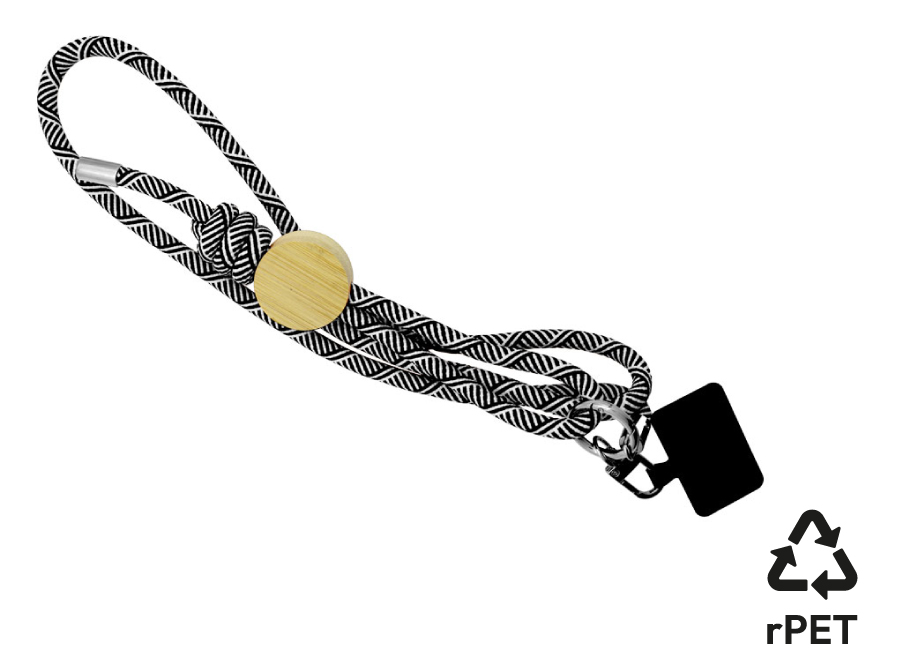 Lanyard aus RPET mit einer Länge von 160 cm und einer Dicke von 8 mm. Universelles und abnehmbares Pad aus Polyester zur Befestigung von Handys mittels ihrer Hülle. Ring und Enden der Schnüre aus rostfreiem Edelstahl. Inklusive Bambus-Schnalle.