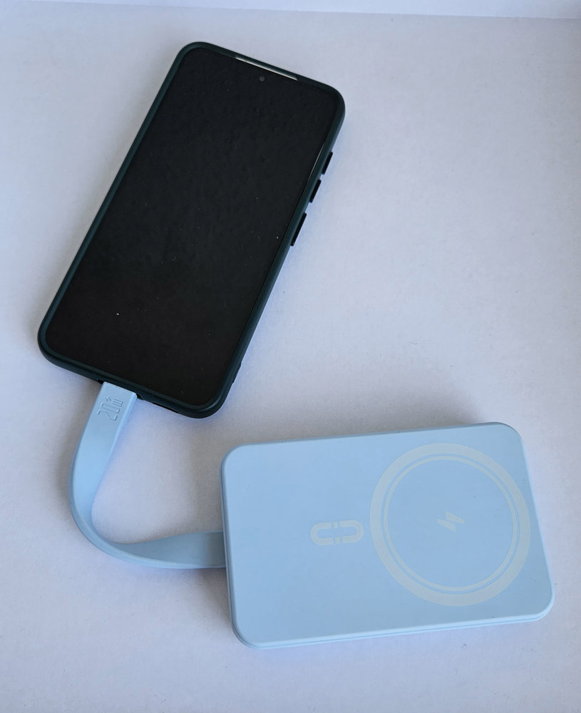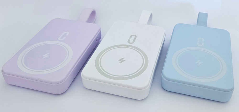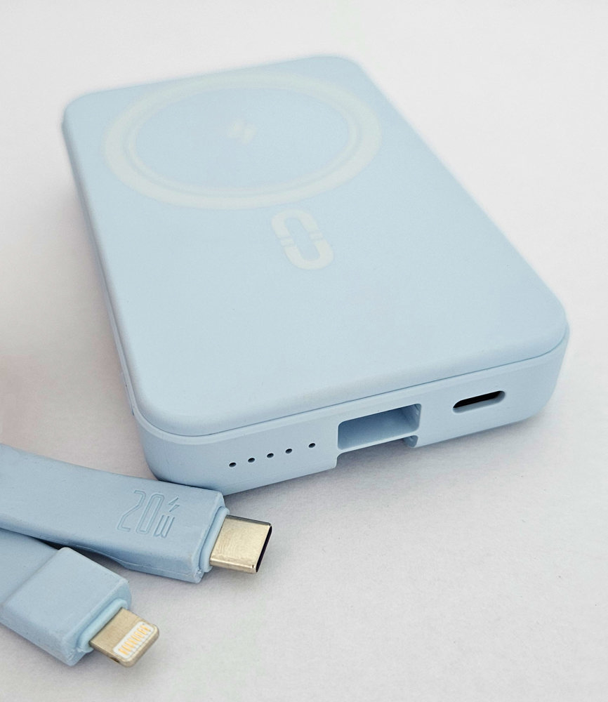 Wireless-Powerbank mit magnetischer Ladefläche und integriertem Ladekabel (USB-C & Lightning). Zur Haftung benötigt das Smartphone eine magnetische Rückseite oder ein magnetisches Ladecase. Kapazität: 10.000 mAh. Maße: ca. 108 x 68 x 19 mm. Farben: weiß, hellblau, lila. Input USB-C: 5V/3A, 9V/2A, 12V/1.5A. Output USB-C & Lightning: 5V/ 3A, 9V/2.2A, 12V/1.6A. Wireless Output: 15W. Veredelung: 1c Druck an einer Position inklusive. Verpackung: weiße Faltschachtel.