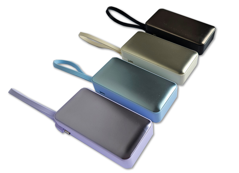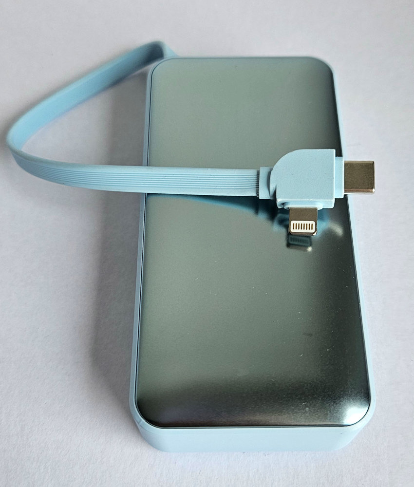 Handliche Powerbank mit 10.000 mAh und integriertem USB-C / Lightning Ladekabel und digitaler Akkuanzeige. Kapazität: 10.000 mAh. Maße: ca. 105 x 53 x 25 mm. Input / Output USB-C: 5V3A,9V2A,12V/1.5A,10V/2.25A. Output USB-A: 5V3A,9V2A,12V/1.5A,10V/2.25A. Output integriertes USB-C Kabel:5V3A,9V2A,12V/1.5A,10V/2.25A. Output integriertes Lightning Kabel: 5V/2.4A. Farben: beige, schwarz, lila, hellblau. Veredelung: 1c Druck an einer Position inklusive. Verpackung: weiße Faltschachtel