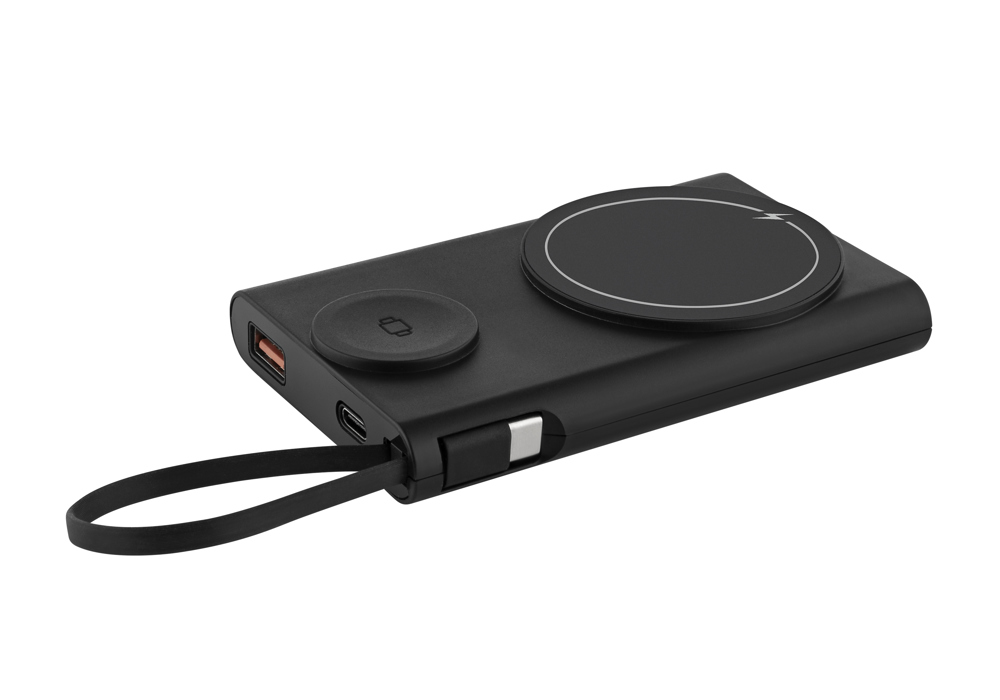 Die Metmaxx® Powerbank „Dr.ChargeUniversalPro10“ bietet beeindruckende 10.000 mAh Leistung in einem außergewöhnlich kompakten Format. Mit der superschnellen PD (Power Delivery) 20 Watt Fast Charging Technologie (kabelgebunden), lädt sie Geräte blitzschnell auf – Dualport In- oder Output. Schnelles kabelloses Laden per Magsafe® Wireless Fast Charging (15 Watt inkl. 3 Watt für Airpod®), zweites Induktionsfeld speziell für die Apple® Watch (2.5W) optimiert. So haben Sie immer die richtige Ladeoption für Ihre Geräte zur Hand – völlig kabellos und mühelos. Auch andere Geräte können Dank des zusätzlich eingebauten Kabels (USB-C) sofort und überall mit Energie versorgt werden. Der integrierte Sicherheitskreislauf (SecuityCircuit) schützt vor Über-, Unterladung, Überspannung und Überhitzung. Die aus recycelten Materialien hergestellte Powerbank bietet zusätzlich einen versteckten Handyaufsteller, eine brillante Werbefläche und wird in einer umweltfreundlichen Craft Paper Box geliefert.