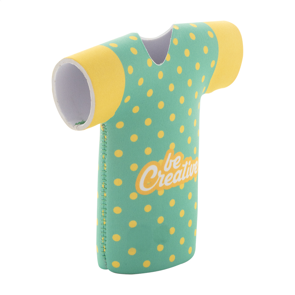 Individueller RPET-Neopren-Bierflaschenkühler in T-Shirt-Form. Mit vollflächigem Sublimationsdruck. Mindestmenge: 50 Stk.