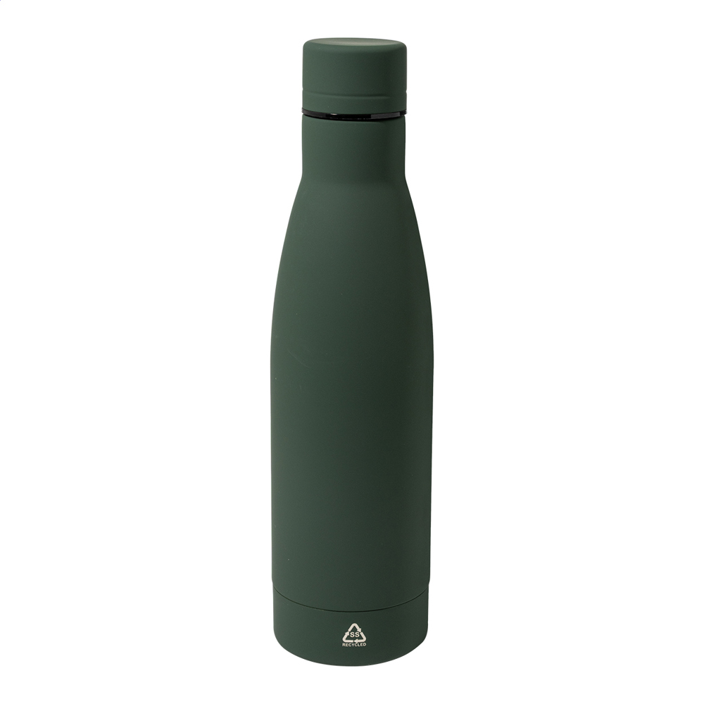 Recycelte Edelstahlflasche mit gummierter Oberfläche. Füllmenge: 750 ml.