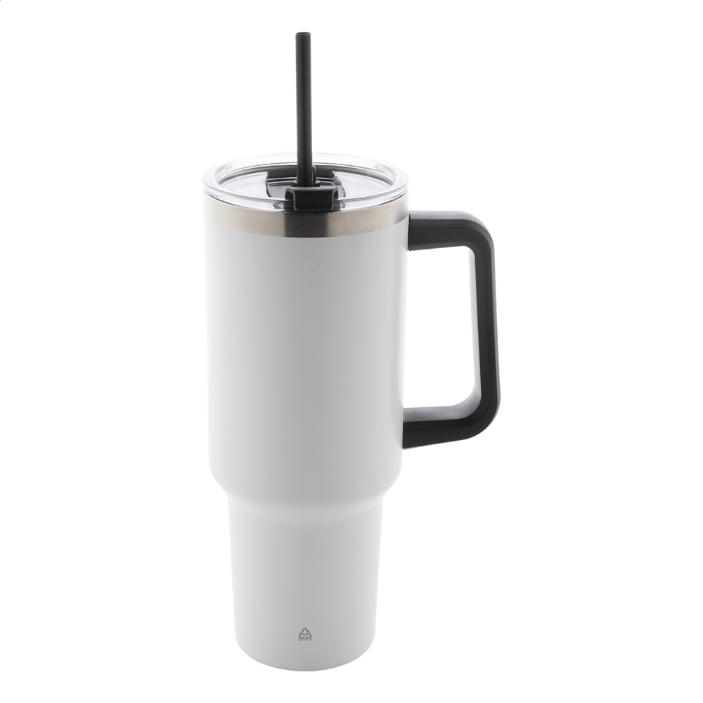 Doppelwandiger, vakuumisolierter Thermobecher aus recyceltem Edelstahl mit PS-Trinkdeckel und PP-Strohhalm. Füllmenge: 1200 ml.