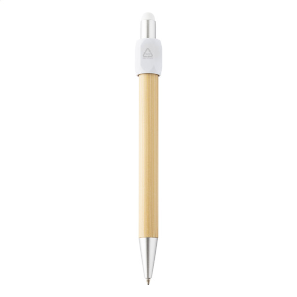 Kugelschreiber aus Bambus mit Touchpen und Fidget Spinner aus recyceltem ABS Kunststoff. Blauschreibend.