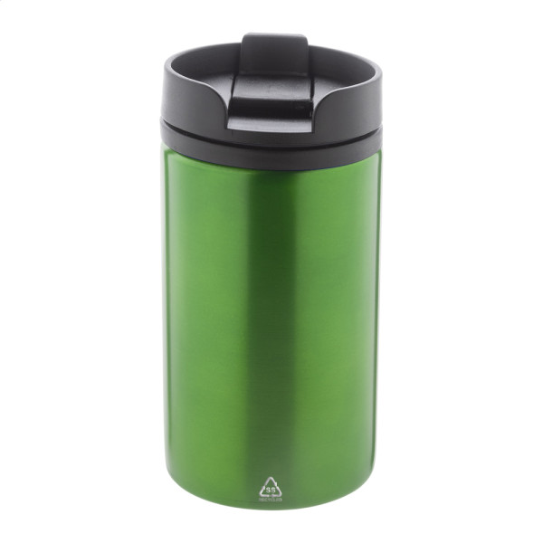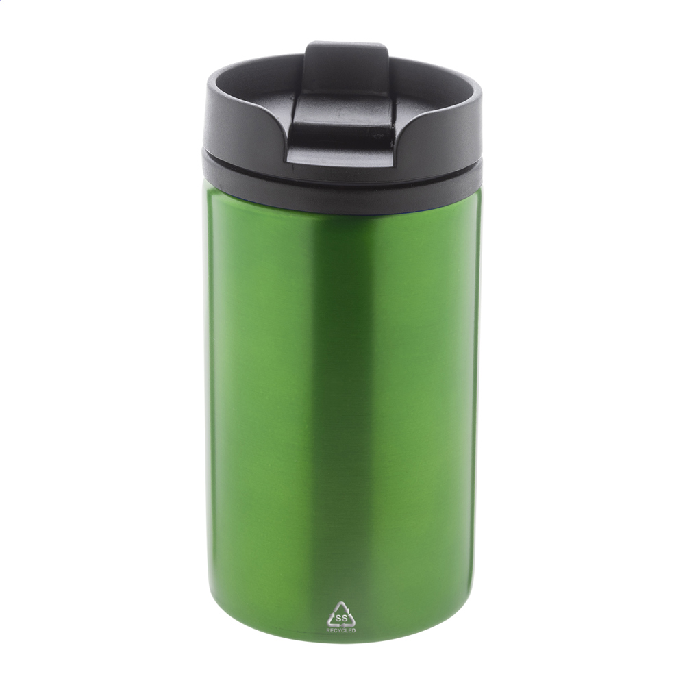 Doppelwandiger, isolierter Thermobecher aus recyceltem Edelstahl mit Innenseite aus PP-Kunststoff und Trinkdeckel. Füllmenge: 250 ml.