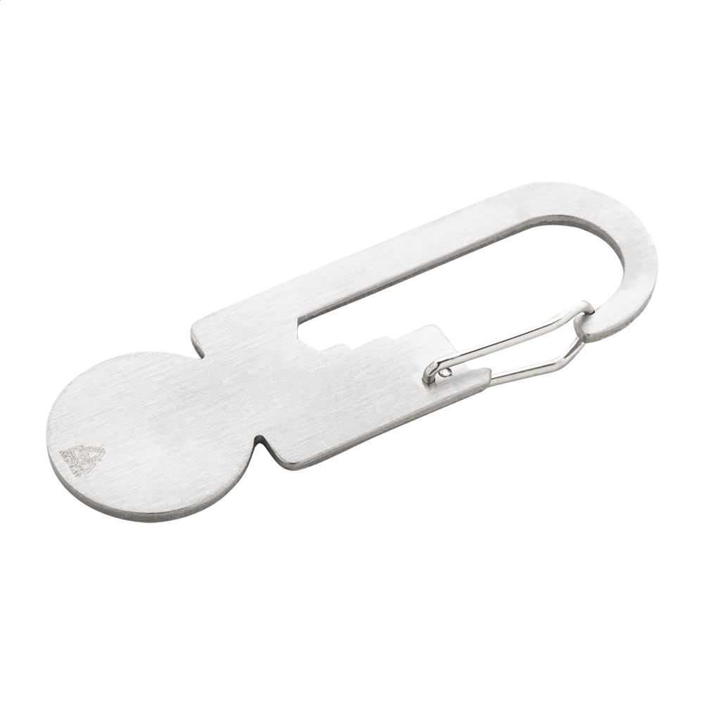 Multitool aus recyceltem Edelstahl mit Karabiner, Einkaufswagen-Chip, Lineal und 3 Flachschlüsseln. mehr