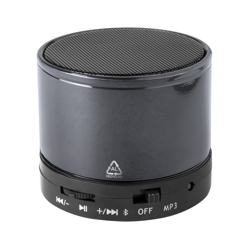 Kabelloser Lautsprecher in einem Gehäuse aus recyceltem Aluminium und recyceltem ABS. Mit Radio, MP3-Player, Freisprechfunktion und eingebautem, wiederaufladbarem Akku (300 mAh). Inklusive USB-Ladegerät und Aux-In-Kabel.